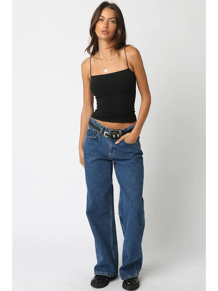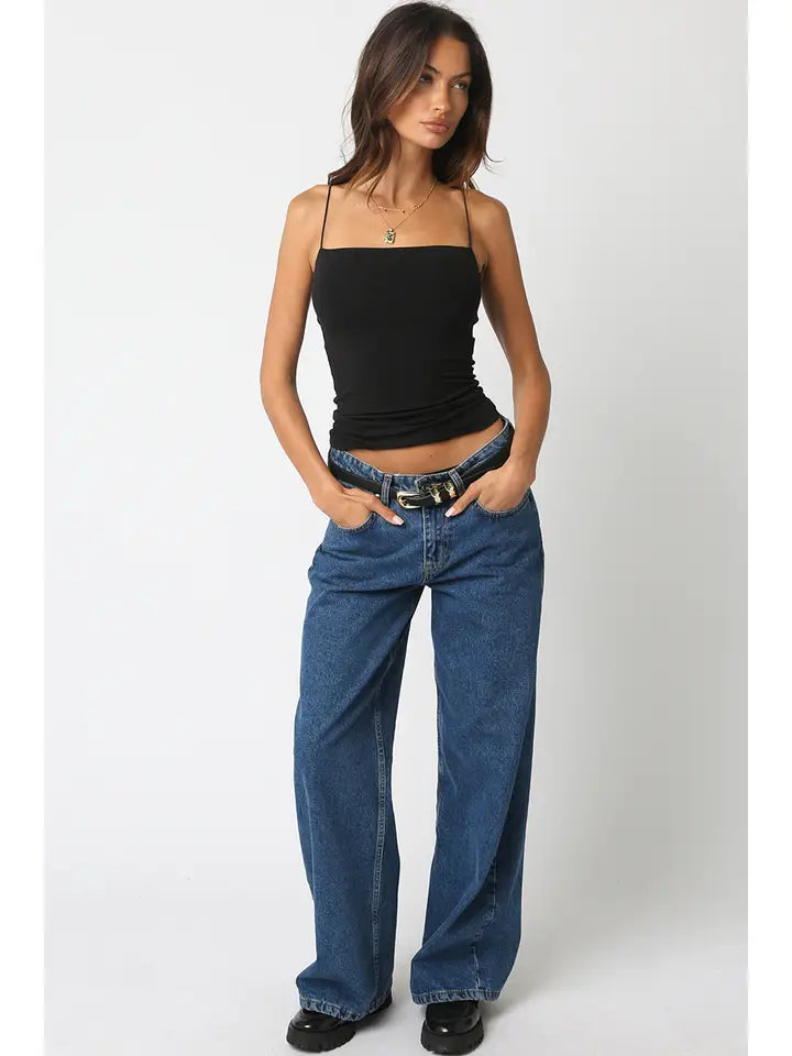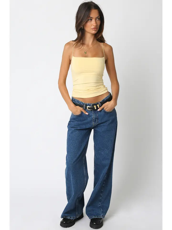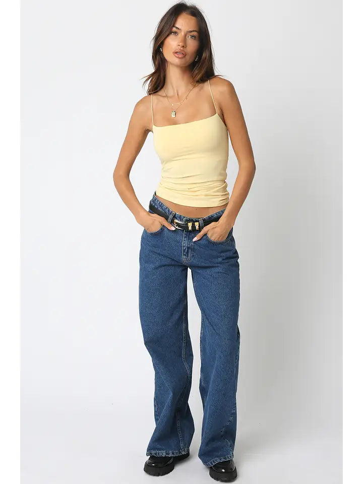 Our Emmy Tank Top features spaghetti straps and a soft ribbed fabric with a body-hugging fit with square neck.