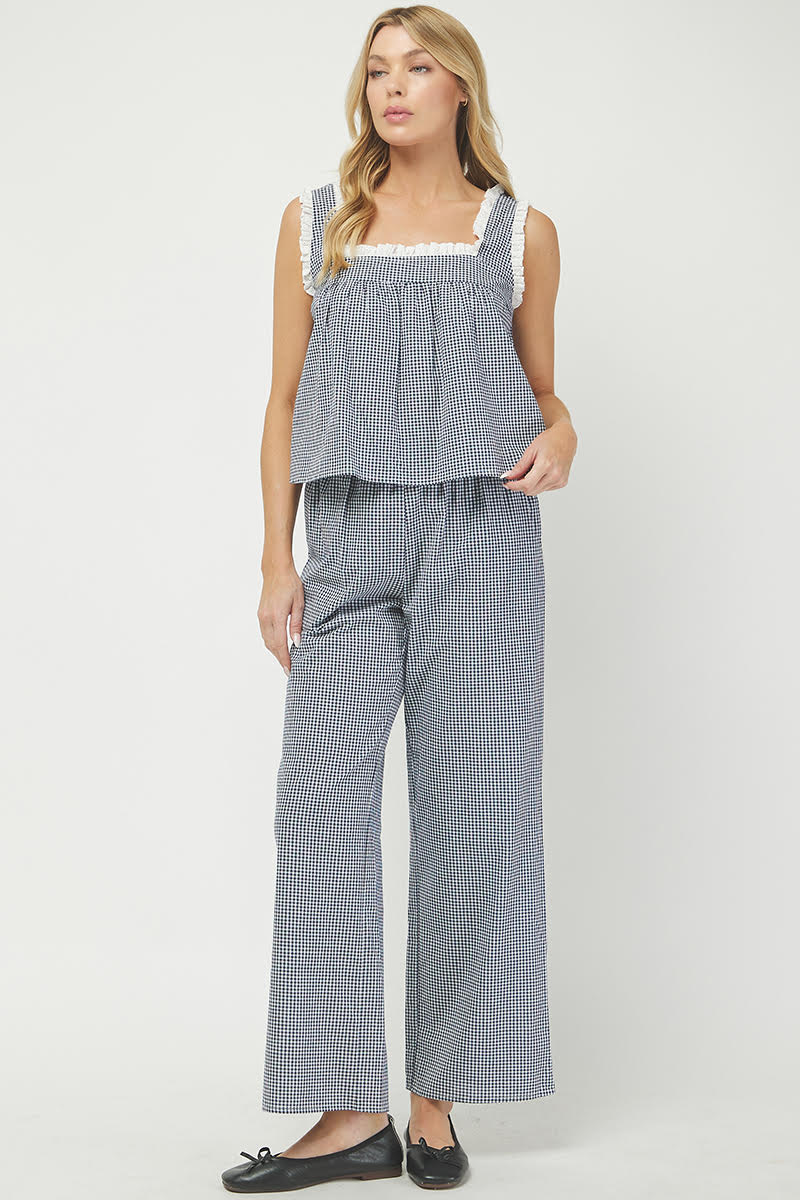 This top features the classic gingham pattern with a cotton eyelet trim along the neckline.